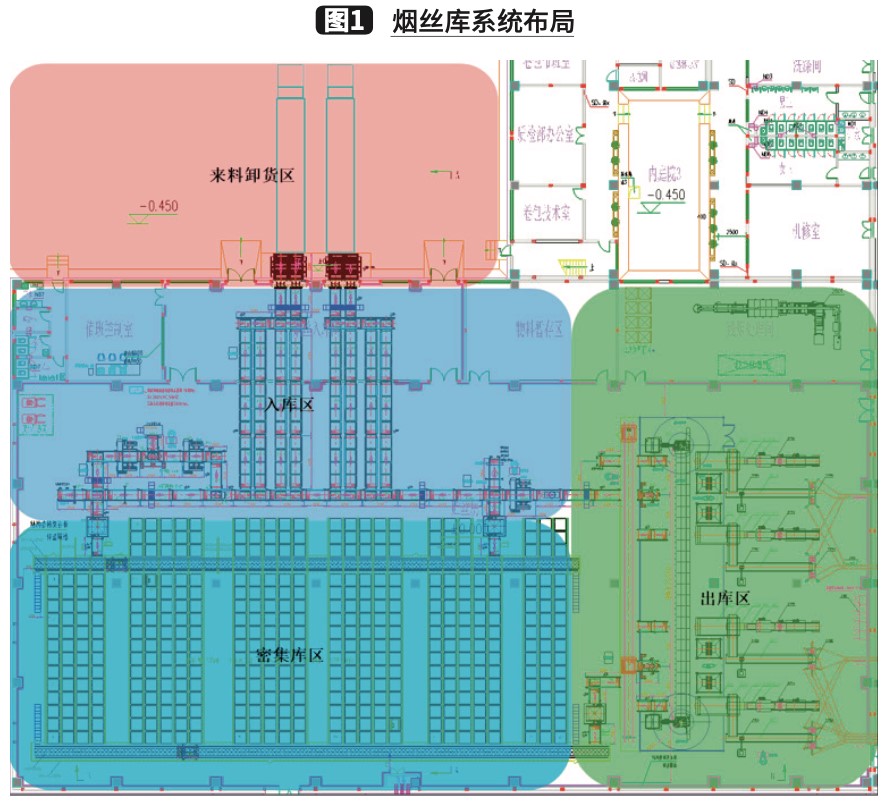 洛陽卷煙廠煙絲庫倉儲系統由貨架系統、子母車系統、穿梭車系統、輸送系統及翻箱系統等組成,區域劃分為來料卸貨區、入庫區、密集庫區和出庫區,煙絲庫系統布局如圖1。