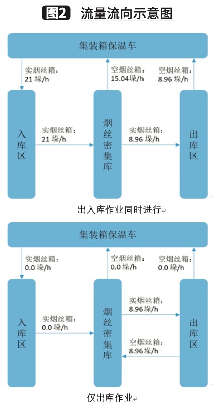 (1)出入庫作業同時進行。系統流量=實煙絲箱入庫流量+實煙絲箱出庫流量+空煙絲箱出庫流量。即:系統流量=21垛/h+8.96垛/h+15.04垛/h=45垛/h;