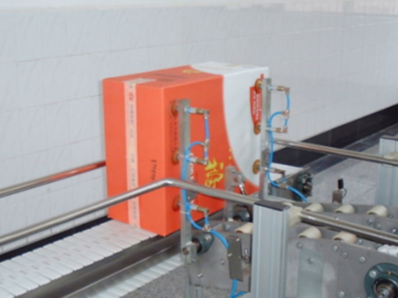 翻箱匯流裝置由光電檢測、氣動機構組成,裝置利用真空吸盤將支線輸送機上的箱體吸住,通過控制氣缸動作使箱體90o翻轉放置在干線輸送機上,從而完成匯流工作。其時序處理由光電檢測機構控制箱體翻轉動作時間來實現。翻箱匯流裝置應用范圍較廣,適用于包括鏈板式、輥子式、皮帶式等多種輸送形式的干線輸送機。